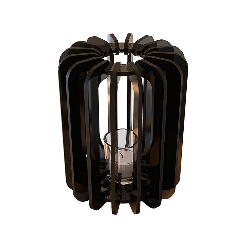 Portavelas de plexiglás negro con diseño moderno y geométrico, ideal para decorar tu hogar con estilo. Su estructura cilíndrica con barras onduladas aporta un toque sofisticado a cualquier espacio. Incluye vaso de vidrio para vela. Perfecto para ambientes cálidos y elegantes.