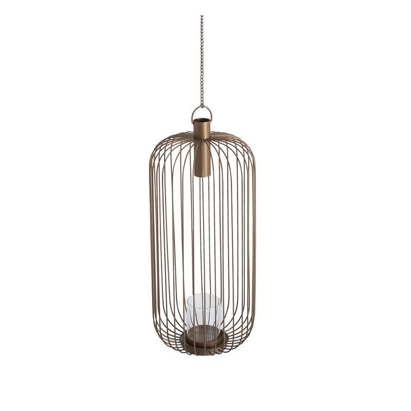 Portavelas colgante de hierro con diseño cilíndrico y estructura de varillas metálicas entrelazadas, acabado marrón elegante. Incluye vaso de vidrio transparente para velas. Ideal para decorar espacios interiores o exteriores con estilo rústico o industrial. Perfecto para crear ambientes cálidos y acogedores en salones, terrazas o comedores.