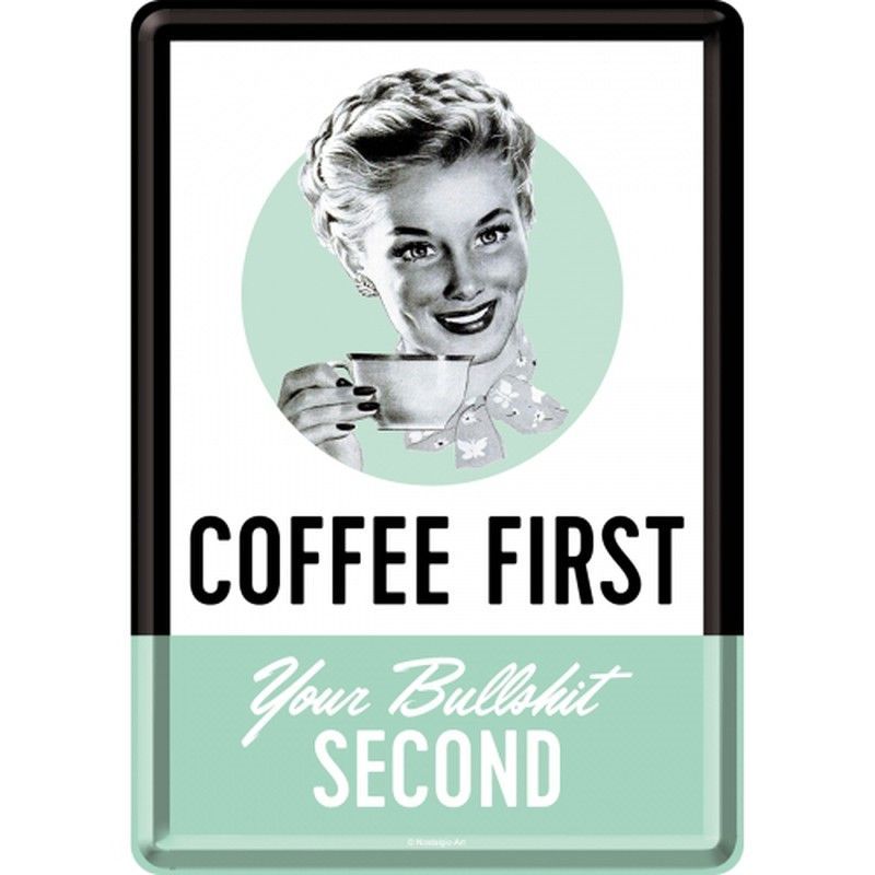 Postal metálica retro con diseño de los años 50, ideal como regalo divertido para amantes del café. Con texto en inglés 'COFFEE FIRST, Your Bullshit SECOND', combina estilo vintage con humor. Fabricada en metal, perfecta para decorar la cocina, oficina o despacho. Un toque de personalidad con calidad duradera.