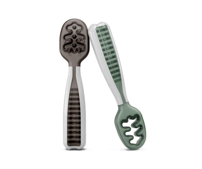 Cuchara pre-masticadora NumNum en tonos gris y verde, ideal para bebés en etapa de dentición. Fabricada en silicona suave y plástico seguro, con diseño ergonómico antideslizante y textura para masajear encías. Perfecta para introducir alimentos blandos y estimular la alimentación autónoma desde los primeros meses.