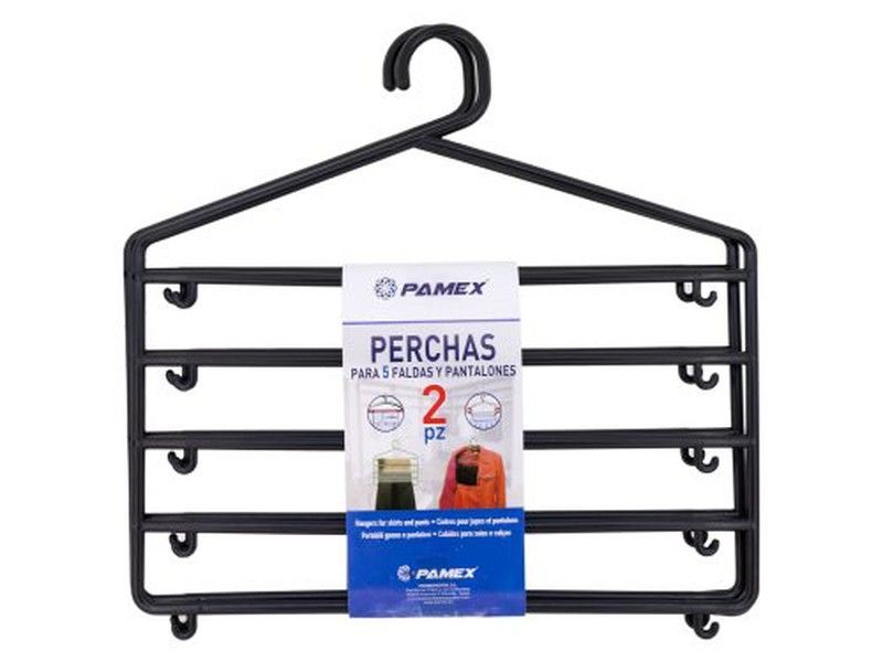 Percha metálica negra con 5 barras para colgar pantalones y faldas, ideal para mantener la ropa sin arrugas. Diseño funcional con ganchos laterales que evitan el deslizamiento. Pack de 2 unidades. Perfecta para armarios y espacios reducidos. Calidad duradera y fácil de usar.