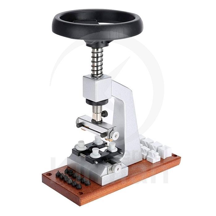 Prensa manual de acero inoxidable con base de madera, ideal para abrir y cerrar fondos de relojes y otros componentes pequeños. Diseño robusto y funcional, con volante negro para mayor control. Perfecta para relojeros, aficionados al bricolaje y reparaciones precisas. Incluye múltiples moldes intercambiables para diferentes tamaños.