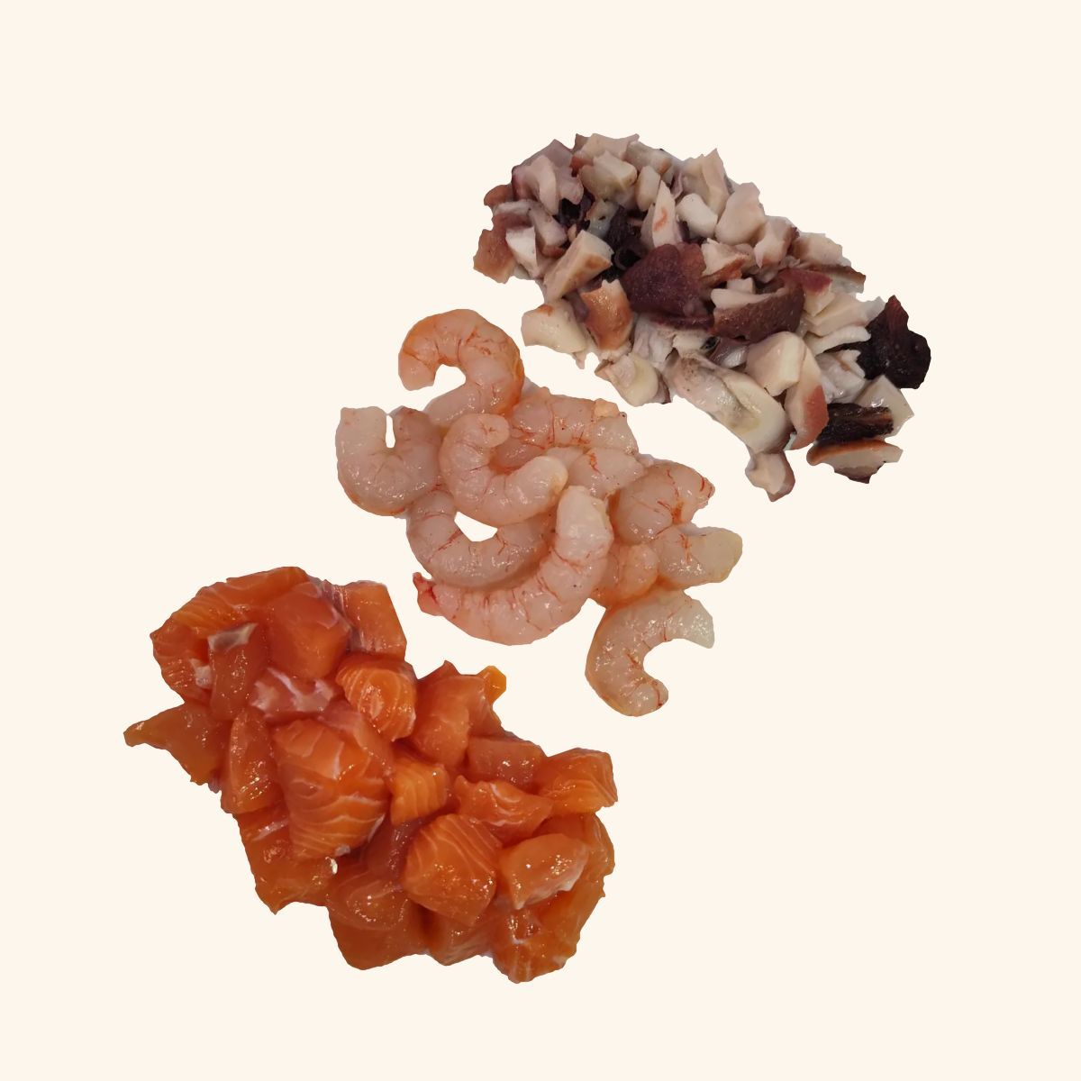 Preparado para pasta de 250g con una mezcla gourmet de salmón ahumado, gambas y setas. Ideal para cocinar platos rápidos y sabrosos. Perfecto para amantes de los mariscos y productos de calidad. Añade sabor y textura a tus pastas favoritas con ingredientes frescos y bien seleccionados.