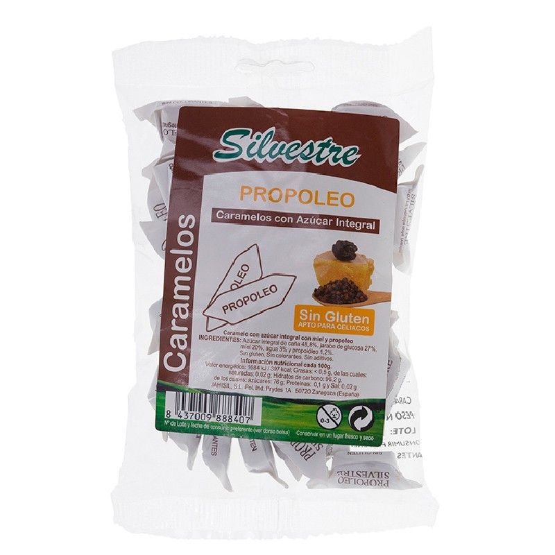 Caramelos Propóleo con Miel de la marca Silvestre, elaborados con azúcar integral y sin gluten. Ideales para adultos que buscan un dulce natural con beneficios para el sistema inmunológico, gracias a la vitamina C y zinc. Embalaje de 1 kg, perfecto para uso diario o como regalo saludable.