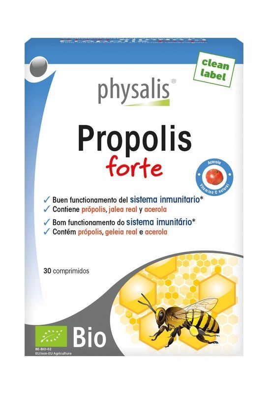 Propolis Forte de Physalis, suplemento natural con própolis, jalea real y acerola para apoyar el buen funcionamiento del sistema inmunitario. Caja de 30 comprimidos con certificación Bio y etiqueta clean label. Ideal para adultos que buscan una nutrición natural y de calidad.