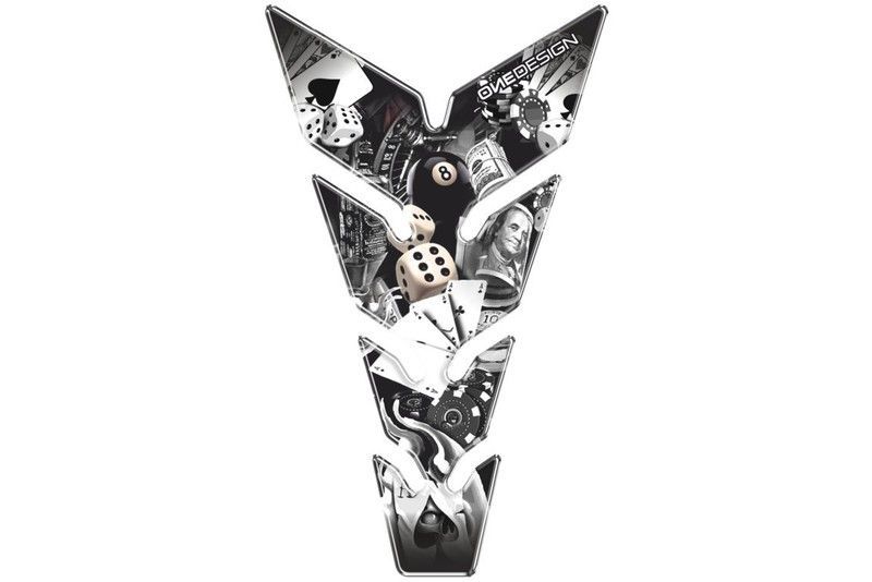 Protector de depósito para motocicleta con diseño temático de casino, ideal para motociclistas que buscan un toque distintivo y personalizado. Fabricado en plástico y metal con acabado brillante, presenta motivos de dados, fichas y cartas en tonos negro, blanco y plateado. Fácil de instalar y resistente a los arañazos, protege tu tanque mientras ap