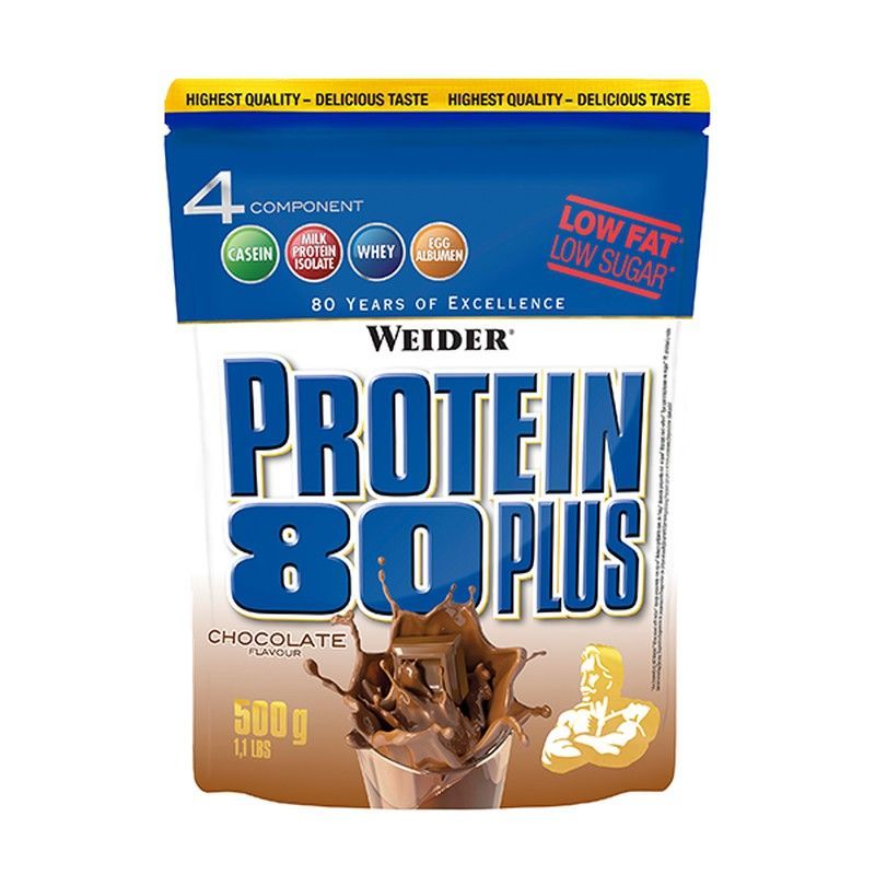 Protein 80 Plus Chocolate de Weider, un suplemento proteico de alta calidad con bajo contenido de grasa y azúcar. Ideal para deportistas y personas que buscan aumentar masa muscular. Con 4 fuentes de proteína (caseína, suero de leche, whey y albúmina de huevo) y sabor chocolate intenso. Paquete de 500 g en envase práctico y atractivo. 80 años de ex