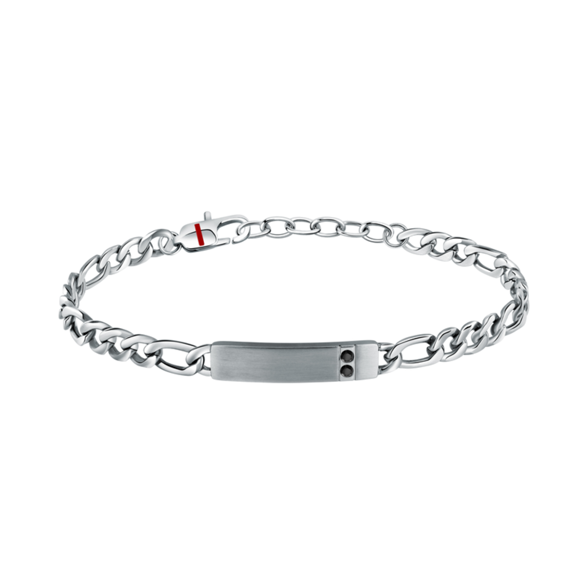 Pulsera Sector para hombre en acero inoxidable con diseño robusto y elegante. Cadenas gruesas y placa central pulida con cristales negros incrustados. Cierre seguro con detalle rojo. Ideal para looks modernos y sofisticados. Calidad duradera y acabado brillante.