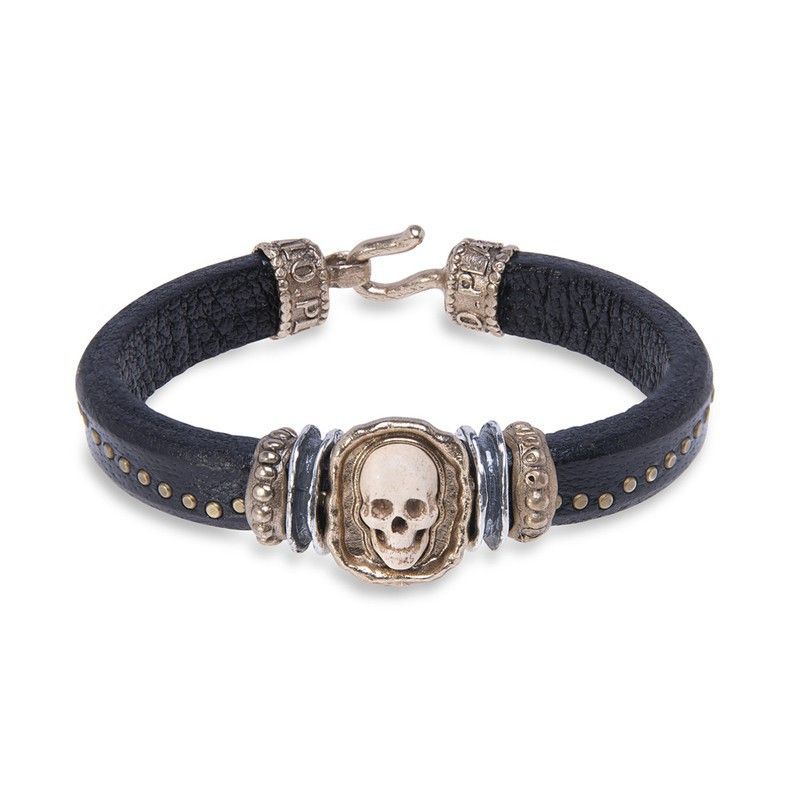 Pulsera de cuero con piezas de bronce, Plata 925 y calavera de resina Referencia:SB112X accesorio con expresión de estilo, diseño y rebeldía