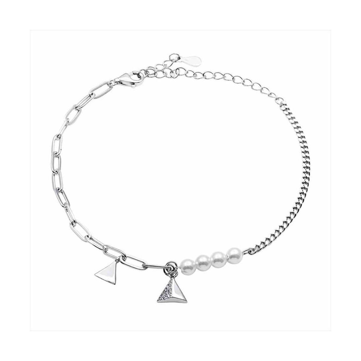 Pulsera de plata con diseño elegante y sofisticado, ideal para mujeres que buscan un toque de estilo. Combina cadenas de eslabones con perlas blancas y colgantes triangulares, uno de ellos con circonitas brillantes. Perfecta para usar diariamente o como complemento en ocasiones especiales. Hecha en metal de alta calidad, ofrece durabilidad y brillo
