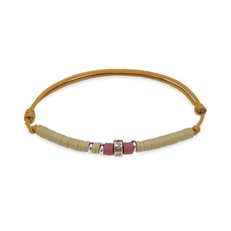 Pulsera PLATA DE PALO ajustable en nylon color mostaza, ideal para uso diario. Con detalles en beige y rosa y un elemento central metálico, combina elegancia y comodidad. Perfecta para adultos que buscan accesorios discretos y sofisticados para su estilo cotidiano.