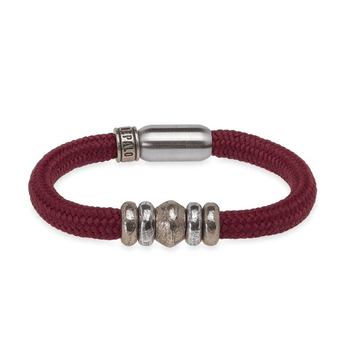 Pulsera con cuerda trenzada de nylon en color granateCierre magnético de acero inoxidable con inscripción 'plata de palo'Cinco cuentas metálicas plateadas con acabado texturizadoDiseño minimalista y elegante