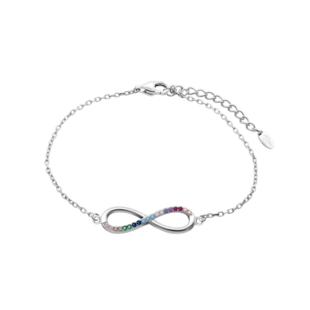 Pulsera de plata con diseño de infinito y circonitas multicolor, ideal para adultos que buscan un accesorio elegante y simbólico. Fabricada en plata de alta calidad, combina estilo y significado. Perfecta para regalar o lucir en cualquier ocasión, añade un toque de color y sofisticación a tu look diario.