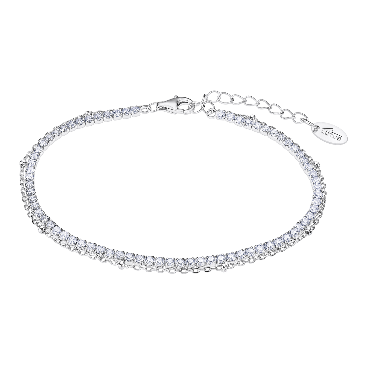 Pulsera Lotus LP3181-2/1 en plata con circonitas brillantes, ideal para mujeres que buscan un toque de elegancia y sofisticación. Diseño fino y delicado, perfecto para combinar con cualquier atuendo. Cierre seguro con cadena extensible y placa con marca. Joyería de calidad para uso diario o ocasiones especiales.