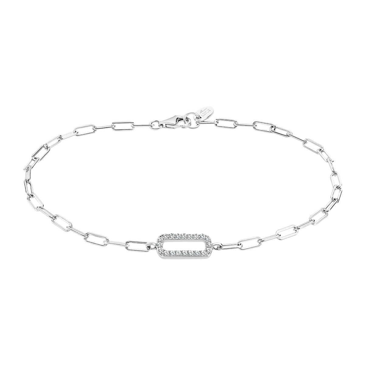 Pulsera Lotus LP3416-2/1 en plata con eslabones delgados y detalles de circonitas en el centro, ideal para mujeres que buscan un toque de elegancia y sofisticación. Diseño minimalista y versátil, perfecto para combinar con cualquier atuendo. Cierre seguro tipo mosquetón. Joyería de calidad para uso diario o ocasiones especiales.