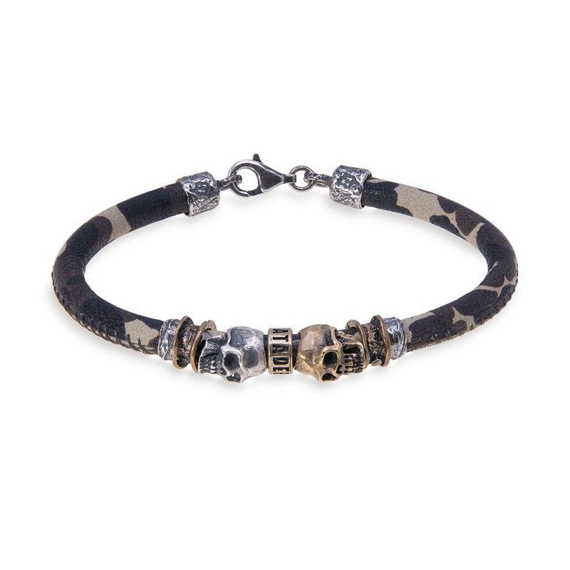 Pulsera unisex PLATADEPALO Skull SB058X con banda de cuero en estampado camuflaje y dos calaveras metálicas en acabado plateado y bronceado. Cierre de mosquetón con detalles grabados. Ideal para amantes del estilo rock, urbano o punk. Diseño robusto y detallado, perfecto para combinar con looks casuales o atrevidos.
