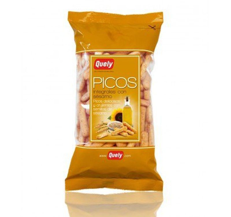 Quely Picos Integrales con Sésamo, 225g: deliciosos aperitivos salados elaborados con harina integral y semillas de sésamo, ideales para disfrutar como snack saludable o acompañamiento. Envase práctico y transparente que muestra los picos crujientes y dorados. Perfectos para compartir en cualquier momento del día.
