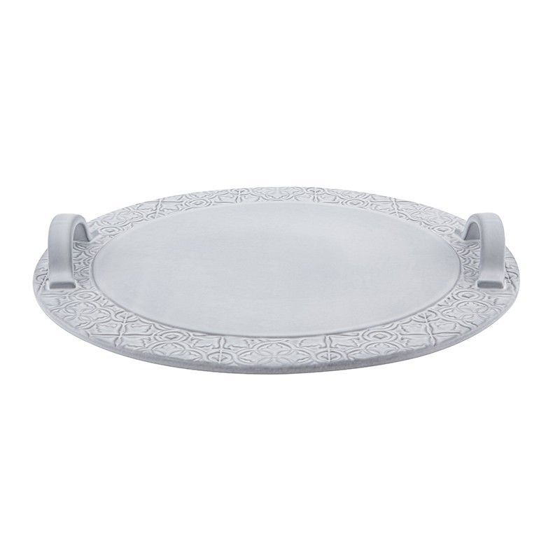 Quesera de loza en blanco envejecido, ideal para servir quesos, frutas o aperitivos con estilo rústico. Con asas laterales para un manejo cómodo y diseño decorativo en el borde, esta pieza combina funcionalidad y elegancia. Perfecta para mesas de comedor o como centro de mesa decorativo. Dimensiones: 35,5 x 35,5 x 5 cm.