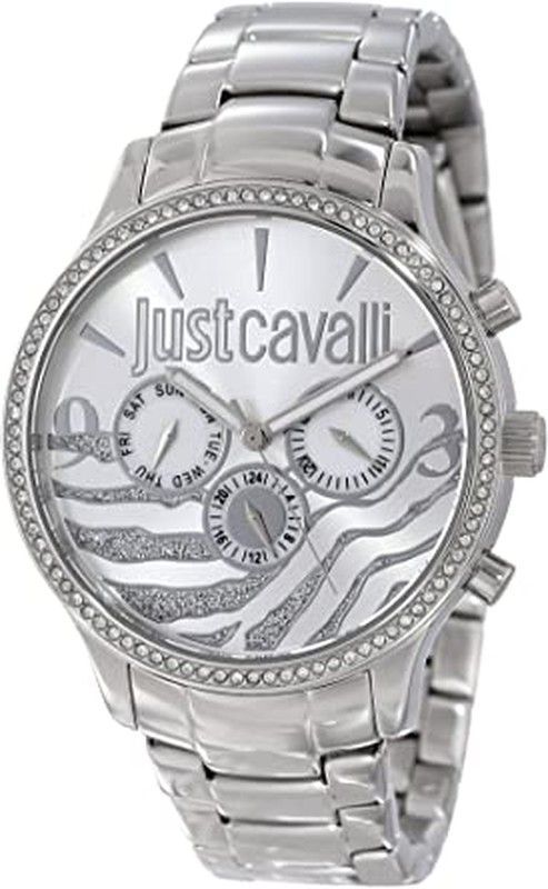 Reloj Just Cavalli para mujer con esfera blanca y detalles elegantes en relieve. Correa de acero inoxidable y marco con cristales que aportan brillo. Funciones cronógrafo y día de la semana. Diseño sofisticado y moderno, ideal para looks urbanos y formales. Calidad premium y acabado pulido.