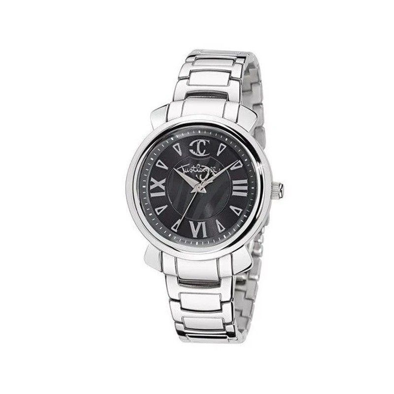 Reloj Just Cavalli para adultos con caja y correa de acero inoxidable 316L. Esfera negra con marcadores romanos y logotipo distintivo. Diseño elegante y sofisticado, ideal para quienes buscan un accesorio de lujo con estilo atemporal. Perfecto para ocasiones formales o diarias.