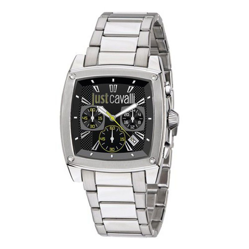Reloj caballero Just Cavalli con esfera negra y detalles amarillos, cronógrafo con tres subesferas y correa de acero inoxidable. Diseño elegante y deportivo, ideal para hombres que buscan estilo y funcionalidad. Perfecto para uso diario o ocasiones especiales.
