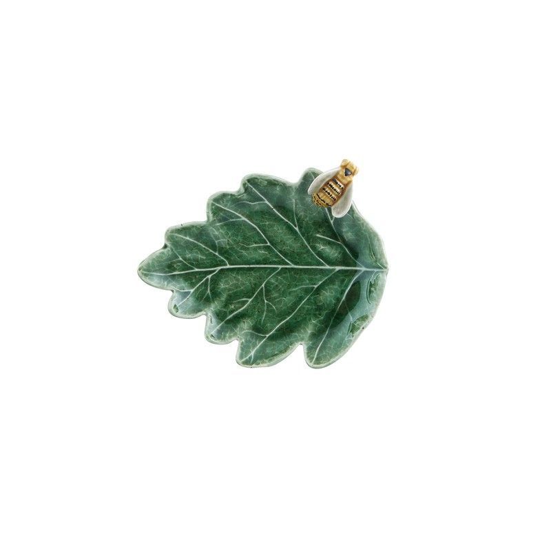 Rabanera de loza con diseño de hoja verde, ideal para servir en la mesa con estilo natural. Hecha de loza de calidad, presenta venas realistas y un acabado brillante. Incluye asa dorada para colgar o colocar fácilmente. Perfecta para cocinas rústicas o comedor con toque campestre. Dimensiones: 13,7 x 11,4 x 3,5 cm.