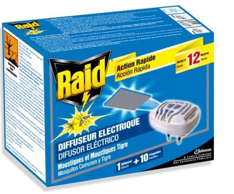 Difusor eléctrico Raid con 10 pastillas incluidas, ideal para combatir mosquitos comunes y tigre. Acción rápida y eficaz hasta 12 horas. Embalaje azul con diseño llamativo y fácil de usar en casa. Solución práctica y eficiente para mantener tu hogar libre de plagas.