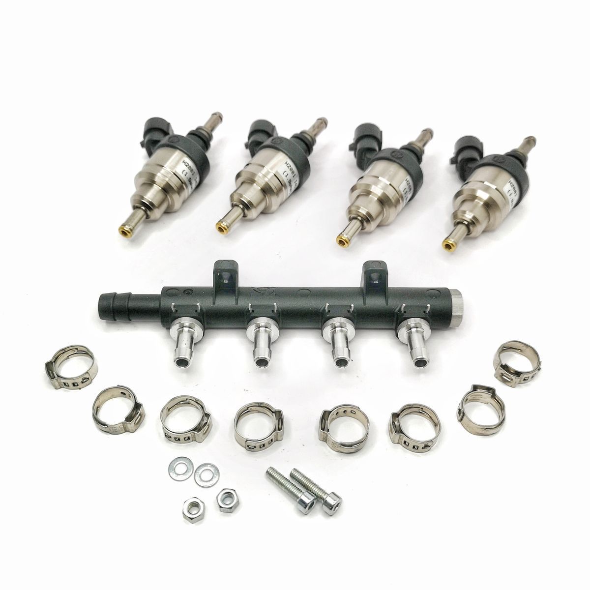 Kit de inyección para motor de 4 cilindros, compuesto por cuatro inyectores de combustible de alta precisión, manifold negro y accesorios de montaje. Fabricado con acero inoxidable y componentes resistentes, ideal para mantenimiento y optimización del rendimiento del motor. Perfecto para mecánicos y entusiastas del automóvil que buscan mejorar la e