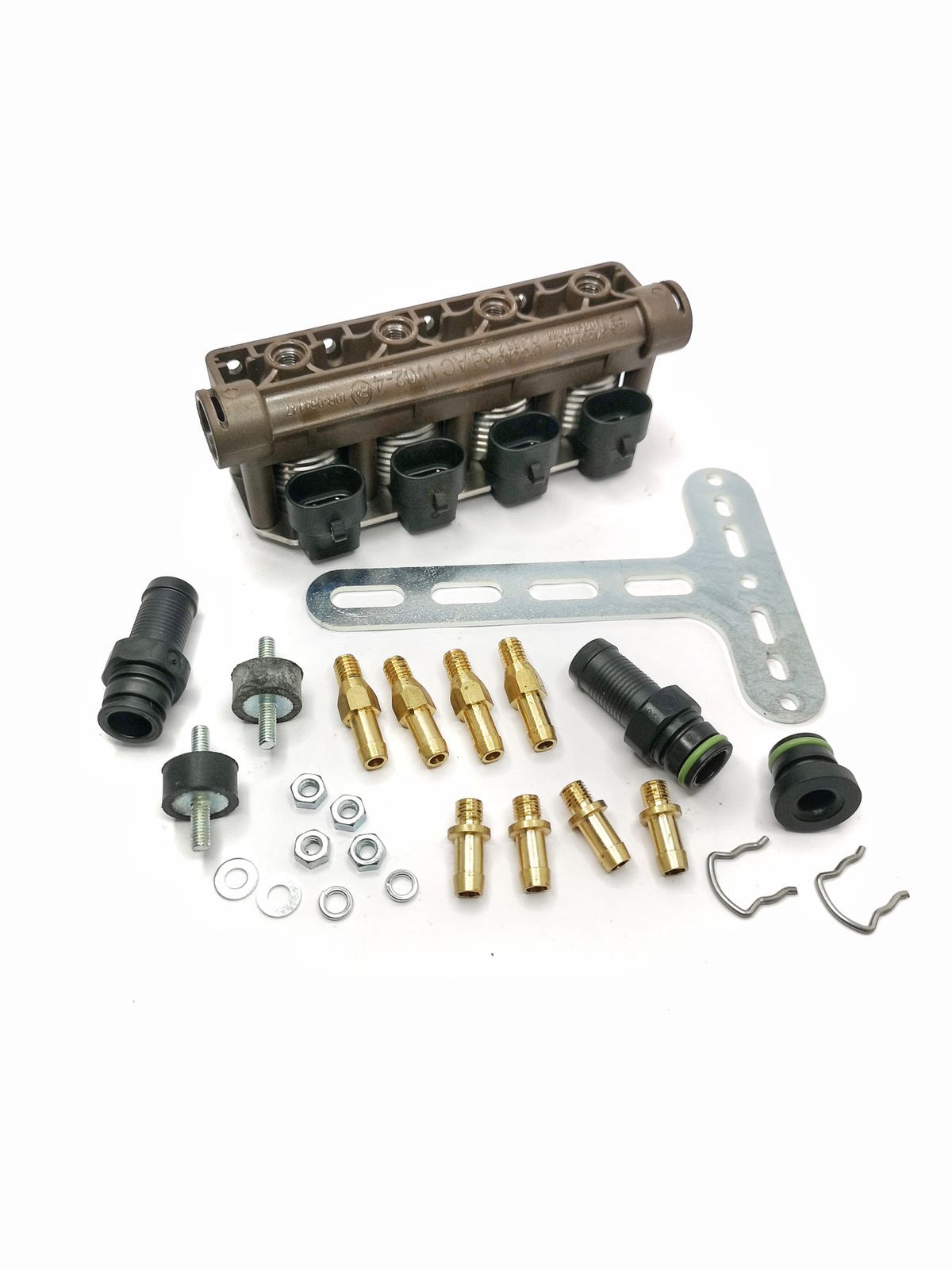Kit de rampa de inyección para 4 cilindros, ideal para mantenimiento y limpieza de inyectores de combustible en vehículos. Fabricado en metal resistente con conectores de bronce y piezas de plástico y goma para una instalación segura. Incluye soporte de montaje, tornillos, arandelas y conectores. Perfecto para mecánicos y entusiastas del automóvil