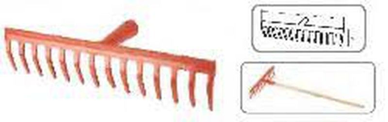 Rastrillo de jardín con 12 púas de plástico naranja y manija de madera, ideal para tareas de jardinería como recoger hojas secas, tierra o residuos. Resistente y ligero, perfecto para uso en huertos, césped o áreas verdes. Diseño ergonómico para mayor comodidad y eficiencia en el trabajo del jardín.
