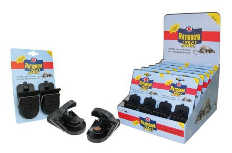Trampa atrayente para roedores en formato blister con dos unidades por paqueteDiseño compacto y funcional con mecanismo de cierre rápidoEmpaquetado en cartón con ventana de plástico transparenteEtiqueta con logotipo 'ratibrom zas' y texto en español e inglésCaja de exhibición con múltiples unidades para venta al por menor