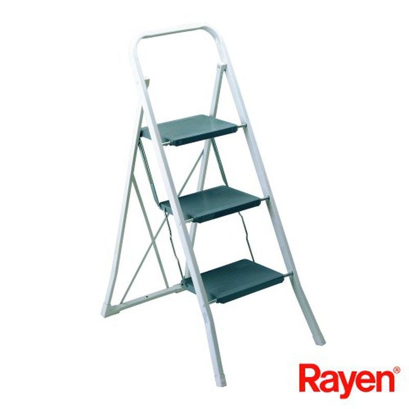 Escalera Rayen Escalin de 3 peldaños, ideal para tareas de bricolaje y mantenimiento en el hogar. Fabricada en metal resistente con peldaños verdes antideslizantes y barra de apoyo superior para mayor seguridad. Diseño plegable que facilita su almacenamiento. Perfecta para alcanzar estantes altos, cambiar bombillas o realizar pequeñas reparaciones.