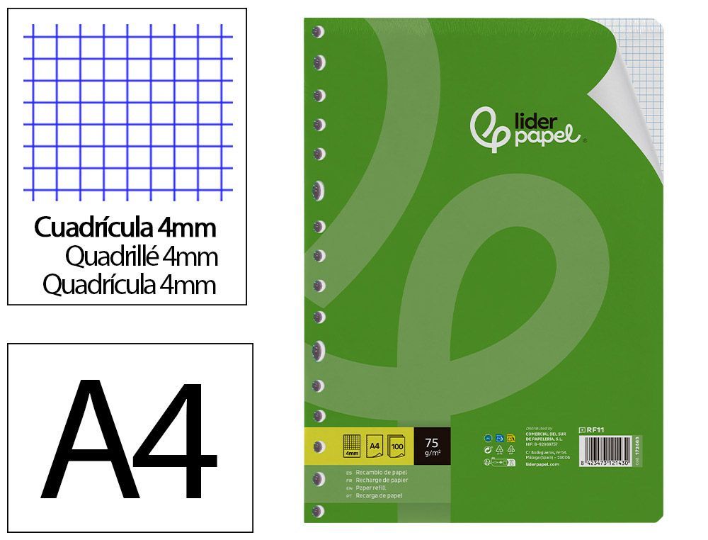 | Nombre | Recambio liderpapel A4 100 hojas 75gr cuadro 4mm con margen 16 taladros |