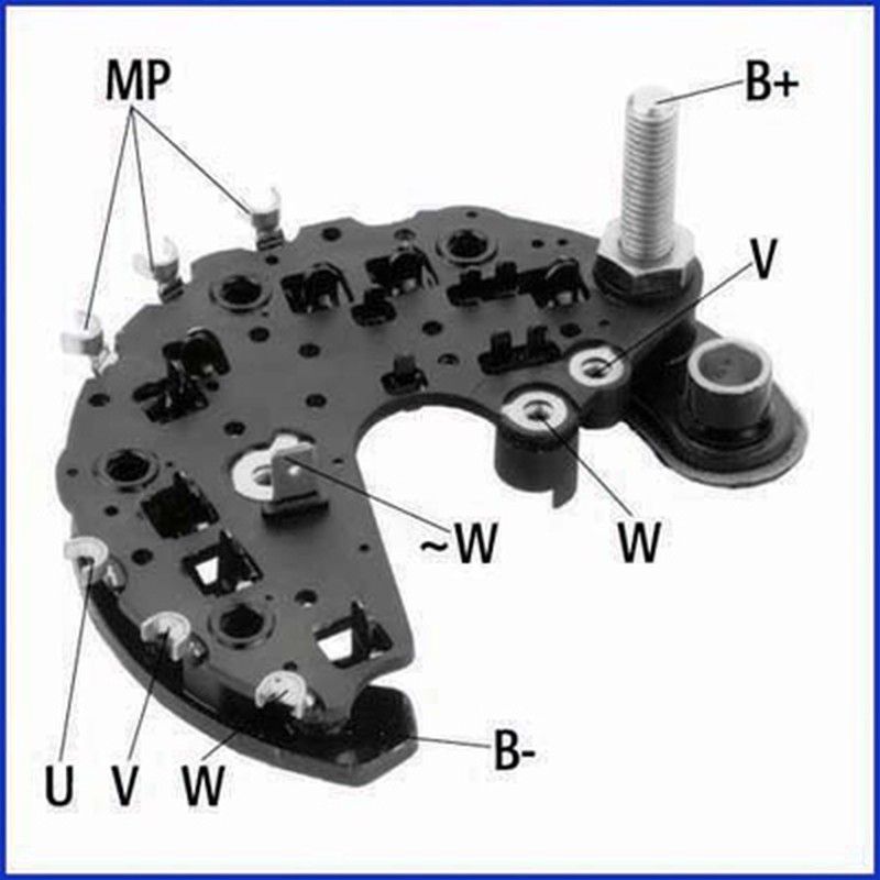Rectificador para alternador de vehículos motorizados, modelo 139722. Fabricado en metal, ofrece alta durabilidad y eficiencia en la conversión de corriente alterna a continua. Ideal para reparaciones y mantenimiento de sistemas eléctricos en motores. Conectores bien marcados para una instalación precisa y segura.