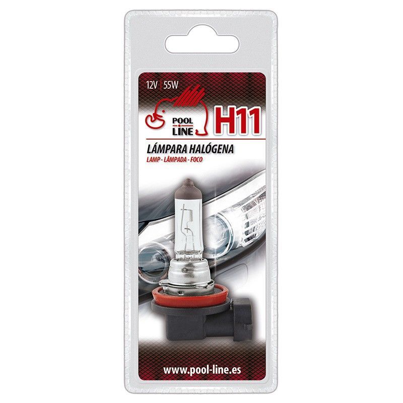 Lámpara halógena H11 de 12V y 55W en blister individual, ideal para faros de vehículos motorizados. Conector PGJ19-2, alta calidad y compatibilidad garantizada. Perfecta para sustitución rápida y eficiente. Incluye marca Pool Line y diseño profesional.