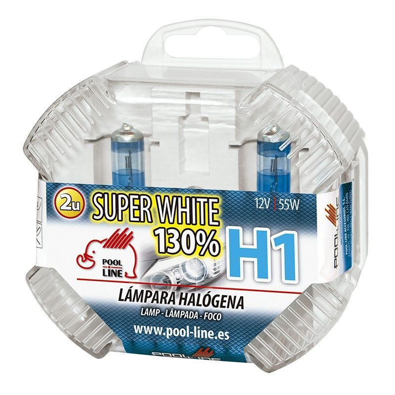 Set de 2 lámparas halógenas H1 de 12V y 55W, con tecnología Super White para un brillo un 130% más intenso. Ideales para mejorar la visibilidad en vehículos motorizados. Empaquetadas en blister transparente con asa para fácil transporte. Fabricadas por Pool Line, reconocida por su calidad en accesorios automotrices.