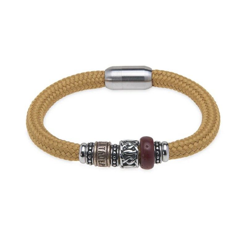 Pulsera elegante y resistente con cuerda trenzada de nylon color mostaza, detalles metálicos plateados con grabado decorativo, una pieza central de resina granate y un acabado en bronce. Cierre magnético de acero inoxidable para mayor comodidad. Ideal para adultos que buscan un accesorio versátil y con estilo, perfecto para combinar con looks casua