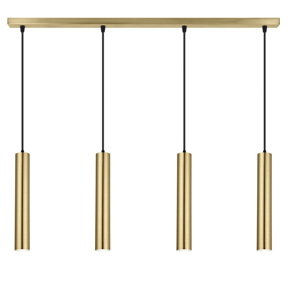 Lámpara colgante Regleta 4L con acabado en latón, ideal para iluminar espacios modernos como comedor o cocina. Diseño minimalista con cuatro cilindros dorados suspendidos por cables negros. Fabricada en metal de alta calidad, ofrece una luz cálida y elegante. Perfecta para decoraciones contemporáneas.