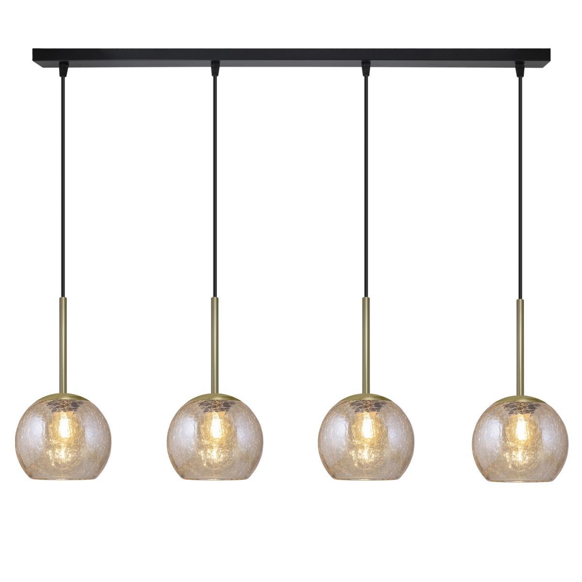 Regleta de lámparas colgantes con 4 bombillas esféricas de vidrio ámbar y acabado dorado, montadas sobre una barra negra. Diseño moderno y sofisticado perfecto para iluminar cocinas, comedores o espacios de trabajo. Fabricada en metal y vidrio de alta calidad, ofrece una luz cálida y ambiental. Ideal para decoraciones contemporáneas y espacios con