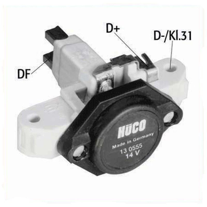 Regulador de alternador HUCO 13 0555, fabricado en Alemania, diseñado para vehículos motorizados. Conectores claramente marcados (D+, D-/KI.31, DF) para una instalación sencilla. Fabricado en plástico y metal resistente, garantiza un rendimiento estable a 14 V. Ideal para mantener la carga de la batería y proteger el sistema eléctrico del vehículo.