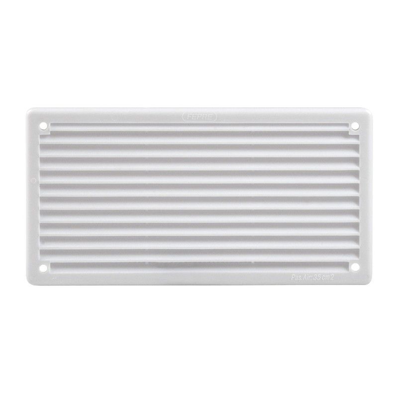 Rejilla de ventilación blanca de plástico, ideal para calentadores de agua. Medidas 8.6 x 16.5 cm, con ranuras horizontales para una ventilación eficiente y cuatro orificios para fijación segura. Diseño resistente y fácil de instalar, garantizando un flujo de aire adecuado y prolongando la vida útil del equipo.