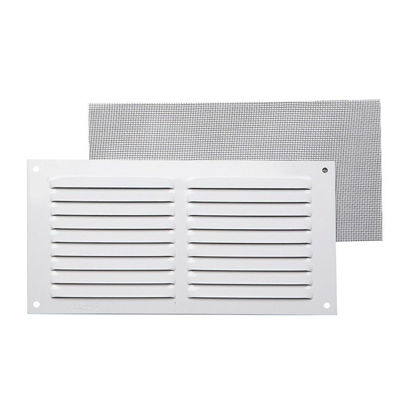 Rejilla de ventilación blanca de 10x20 cm con malla metálica anti-mosquitos, ideal para calentadores de agua. Fabricada en plástico y metal resistente, permite una ventilación eficiente y segura. Fácil instalación con orificios de montaje en las esquinas. Protege tu sistema de insectos y suciedad sin comprometer el flujo de aire.