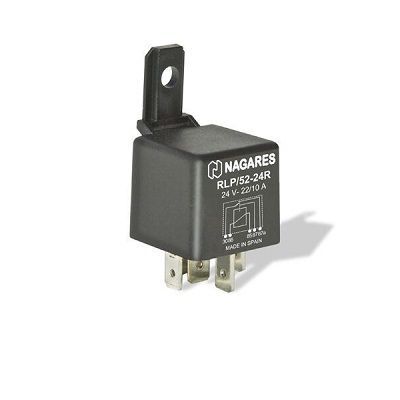 Relé polivalente inversor Nagares RLF52-24R, diseñado para sistemas eléctricos de vehículos motorizados. Funciona a 24 V con capacidad de 22/10 A, ideal para aplicaciones industriales y automotrices. Fabricado en España, ofrece alta fiabilidad y durabilidad. Con carcasa de plástico resistente y terminales metálicos, es fácil de instalar y mantener.