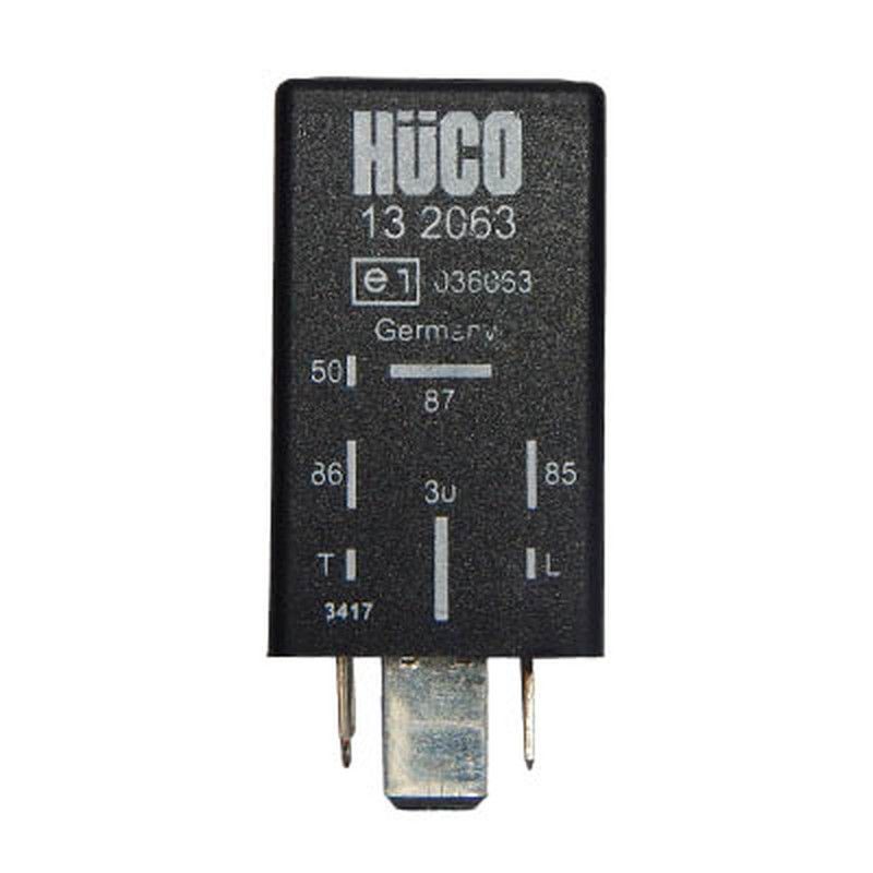 Relé para sistema de precalentamiento HÜCO 132063, fabricado en Alemania. Ideal para vehículos motorizados, ofrece alta fiabilidad y durabilidad. Con carcasa de plástico resistente y terminales metálicos para una conexión segura. Perfecto para sistemas de calefacción en motores diésel. Incluye marcación clara de terminales para una instalación senc