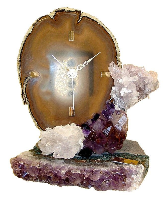 Reloj decorativo de agata sobre base de amatista, con acabado natural y elegante. Ideal para decorar mesas, estanterías o escritorios. Fabricado con cristales auténticos y detalles metálicos plateados. Un toque de lujo y originalidad para tu hogar o oficina.