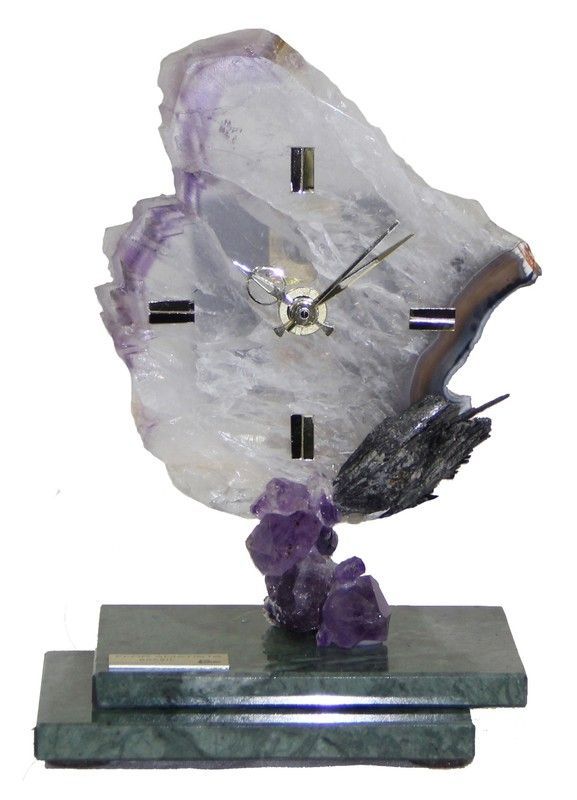 Reloj decorativo de amatista sobre base de mármol verde, ideal para amantes de la decoración natural y elegante. Fabricado con cristales de amatista auténticos y detalles metálicos, este reloj combina funcionalidad con estilo. Perfecto como pieza central en mesas de centro, escritorios o estanterías. Un regalo sofisticado para amantes de la piedra