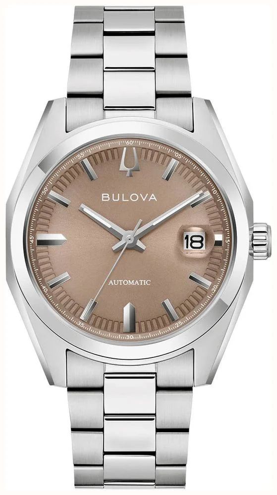 Reloj Bulova para mujer modelo 96B470, con movimiento automático y correa de acero inoxidable. Esfera marrón con marcadores metálicos y ventana de fecha. Diseño elegante y sofisticado, ideal para ocasiones formales o diarias. Calidad duradera y acabado pulido que resalta su estilo clásico.