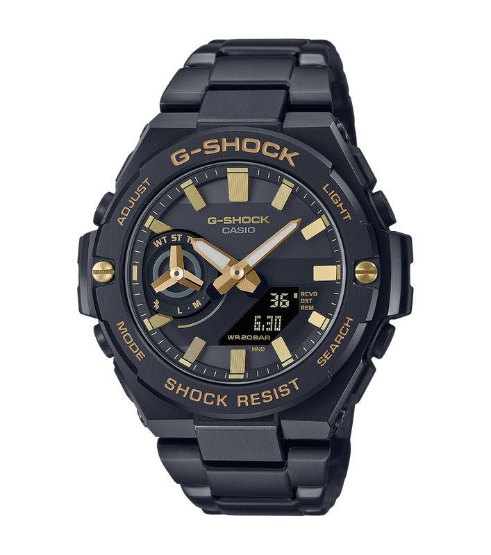 Reloj Casio G-SHOCK G-STEEL GST-B500BD-1A9ER, robusto y elegante, con correa y caja de acero inoxidable negro y detalles dorados. Ideal para adultos que buscan resistencia y estilo. Resistente a golpes y con funciones digitales. Perfecto para uso diario y actividades al aire libre.