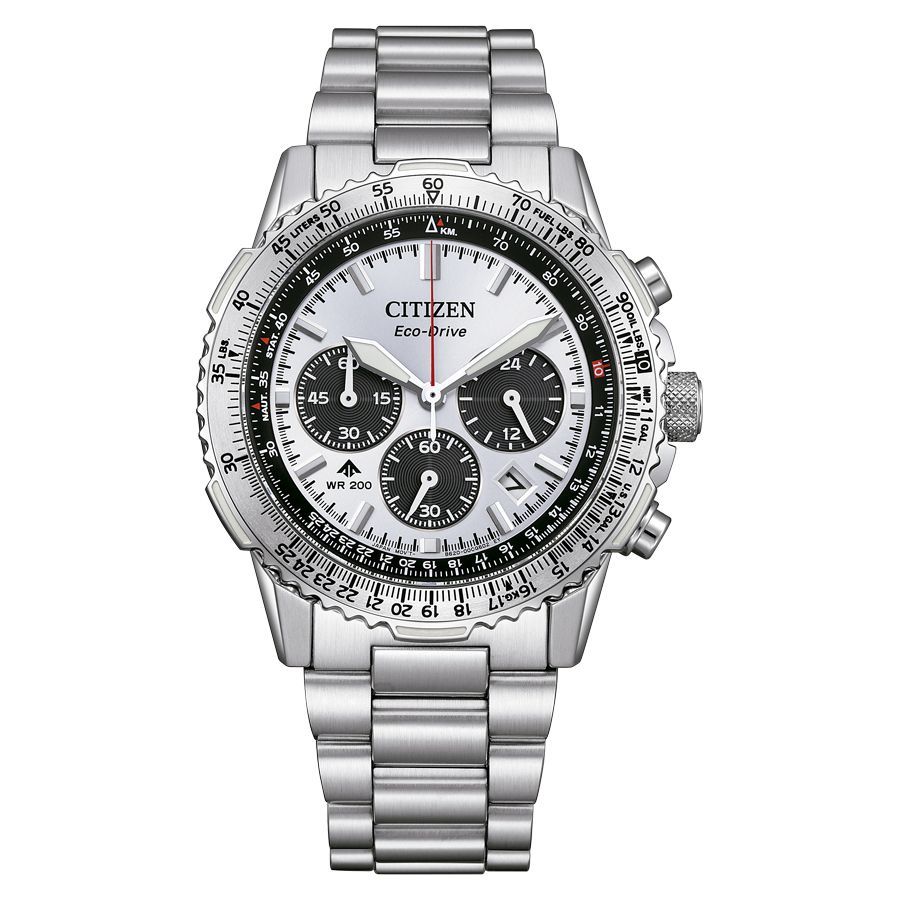 Reloj Citizen Promaster CA4660-61A para hombre, con correa de acero inoxidable y esfera blanca con detalles negros. Cronógrafo con tres subesferas, bisel graduado y tecnología Eco-Drive que se carga con luz. Resistente al agua hasta 200 metros. Ideal para amantes de la precisión y el estilo deportivo.