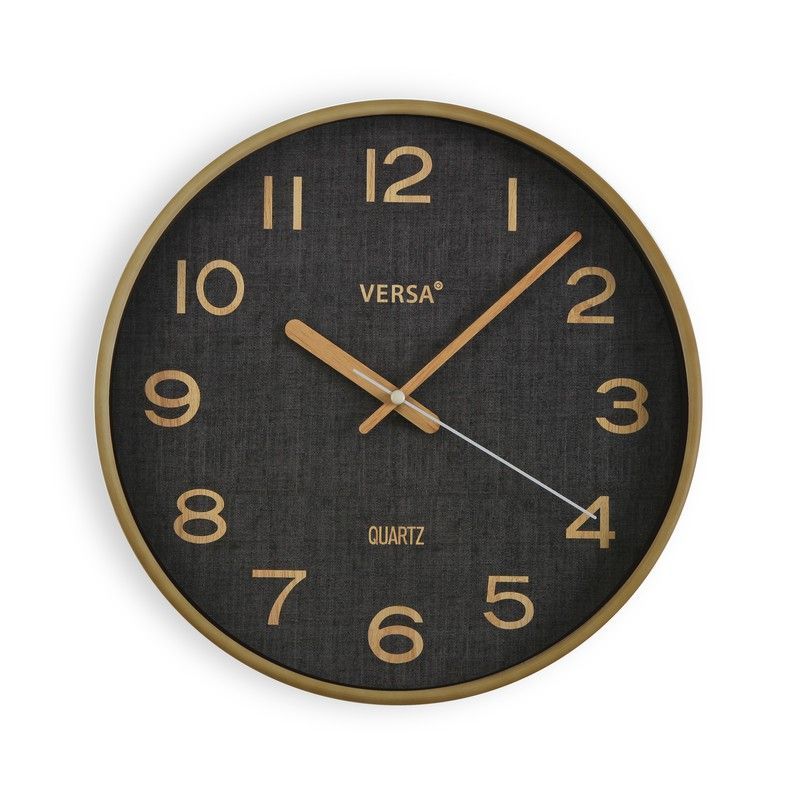 Reloj de pared Versa de 30 cm con diseño elegante y moderno. Esfera negra con textura de lona y detalles dorados, marco metálico dorado y manecillas de madera. Ideal para decorar salones, comedores o oficinas con estilo. Movimiento de cuarzo preciso. Aporta un toque sofisticado a cualquier espacio.